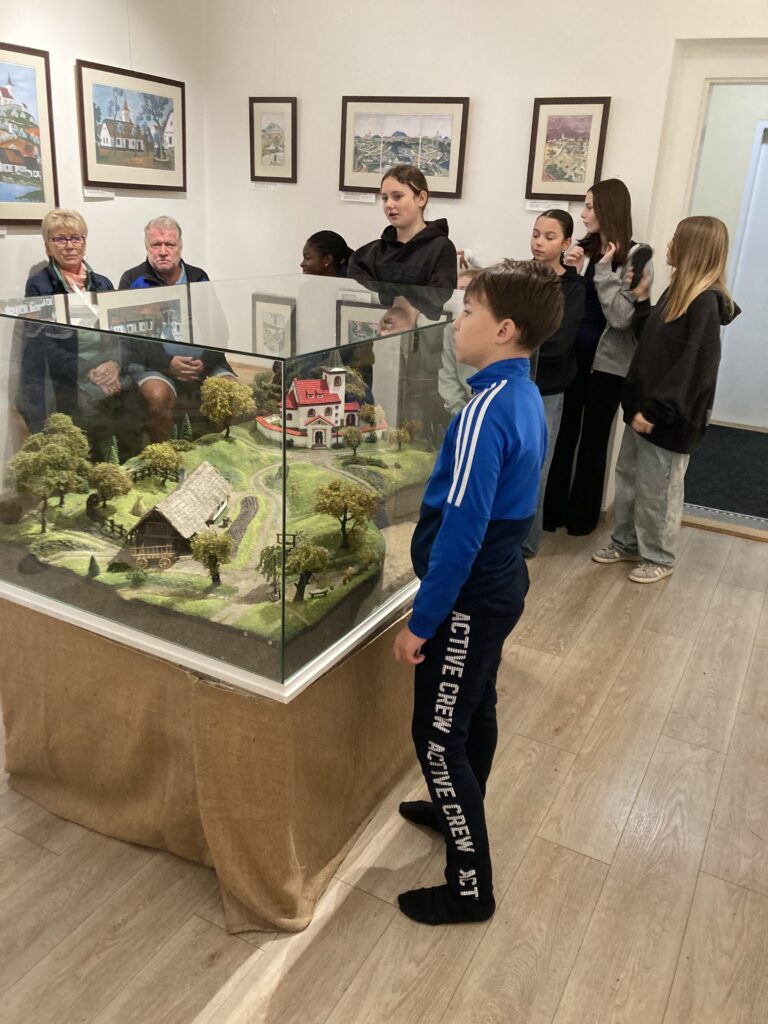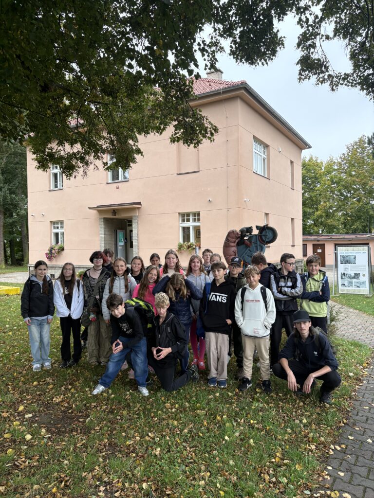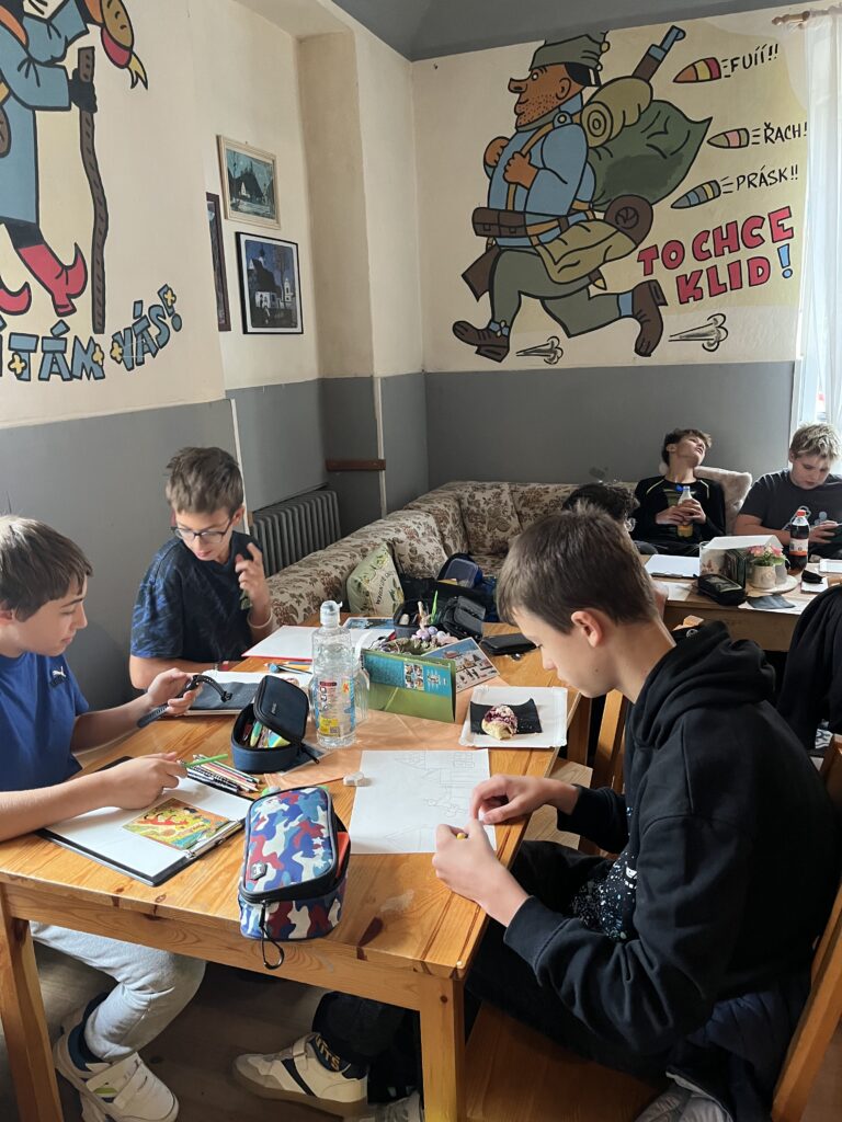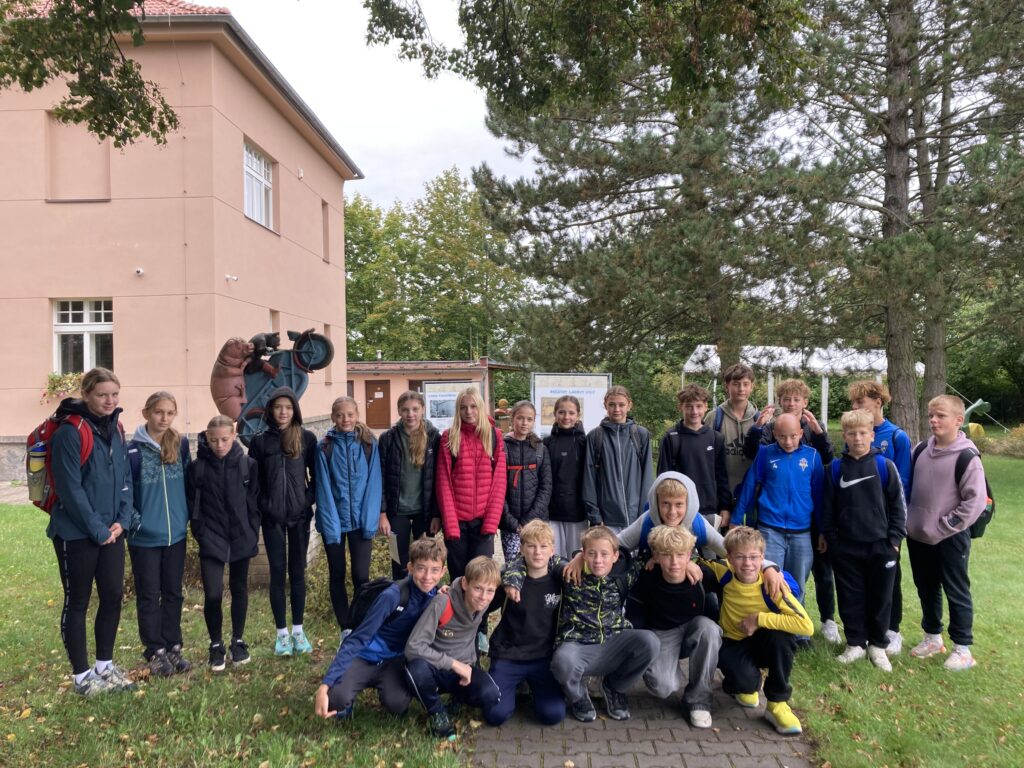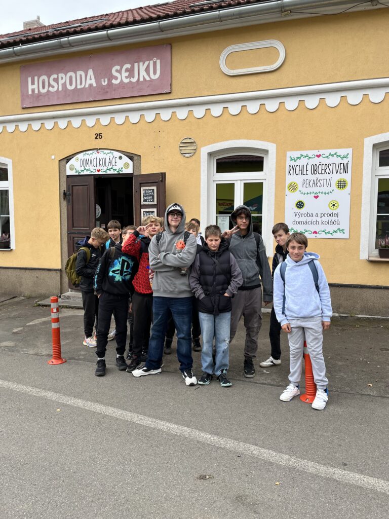V průběhu čtvrtého zářijového týdne se sedmáci vypravili do Hrusic, aby navštívili Památník Josefa Lady a jeho dcery Aleny. Ten se nachází v domě č. p. 115, který využívala Ladova rodina k letním pobytům. Hned u vjezdu stojí dvě mohutné lípy, které tam zasadil sám Josef Lada na památku narození dcer Aleny a Evy. Uvnitř „Ladovy vily“ jsme se s průvodkyní vydali po stopách známého malíře, prohlédli si rodinné fotografie, model jeho rodného domku i hrusického kostela. Viděli jsme také spoustu Ladových obrázků, které nám posloužily jako předloha k našim vlastním „výtvorům“. Exkurzi jsme zakončili v místní pekárně, kde jsme se občerstvili výtečnými koláčky. Všichni si celý den opravdu užili, jen Mikeše jsme bohužel nepotkali.