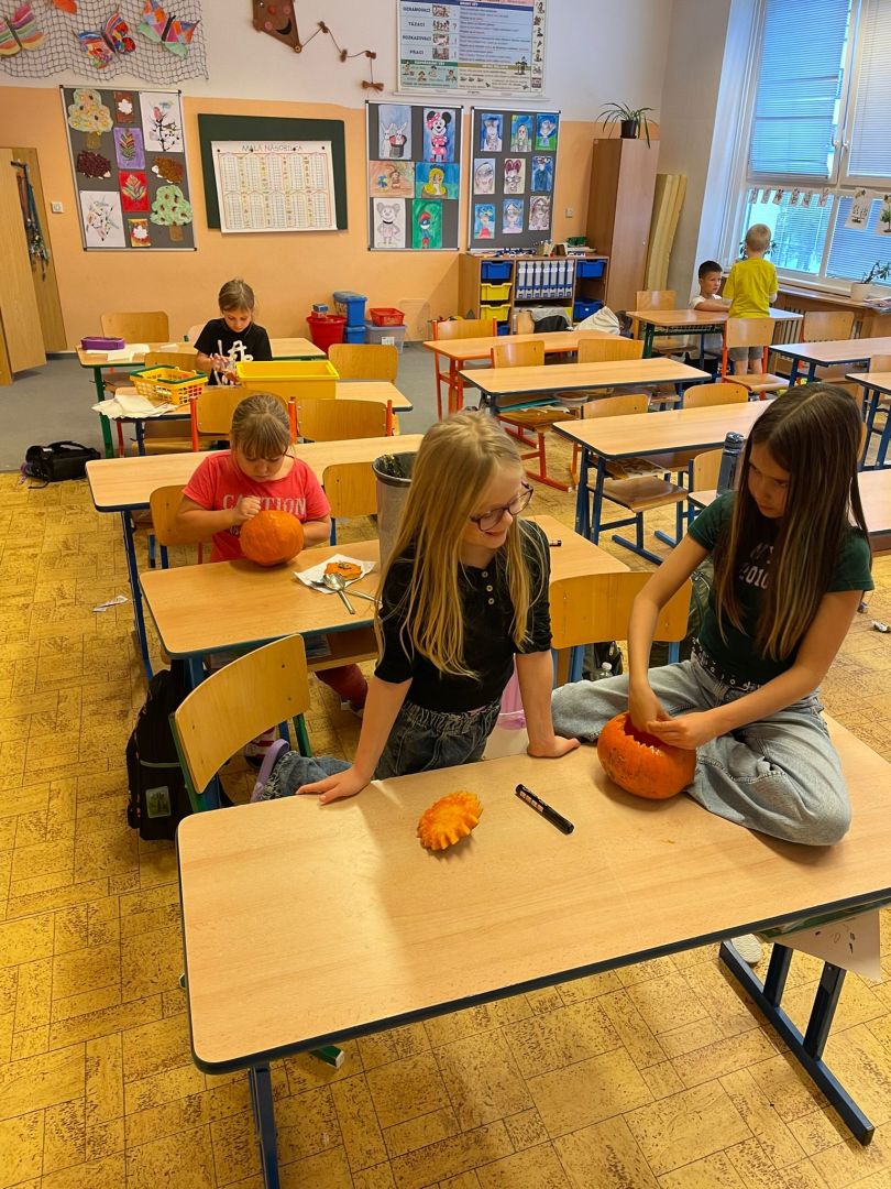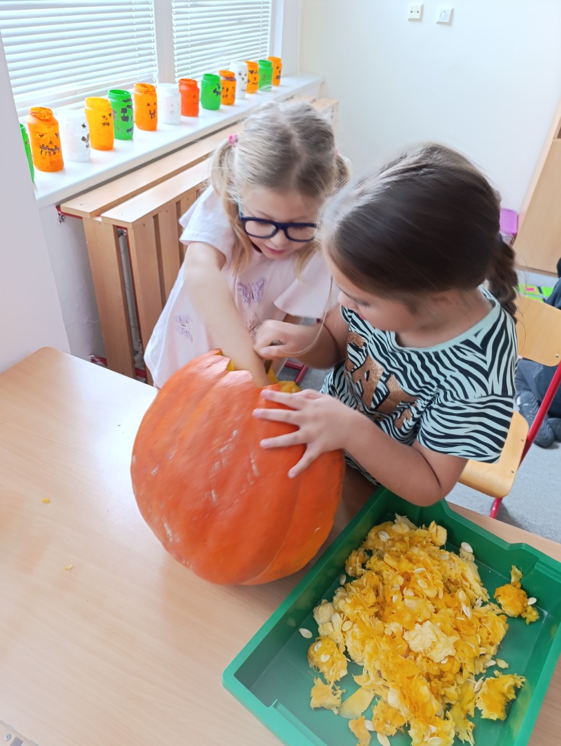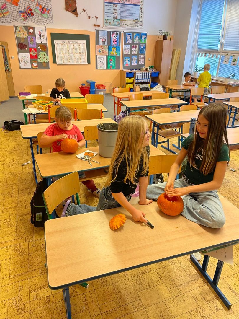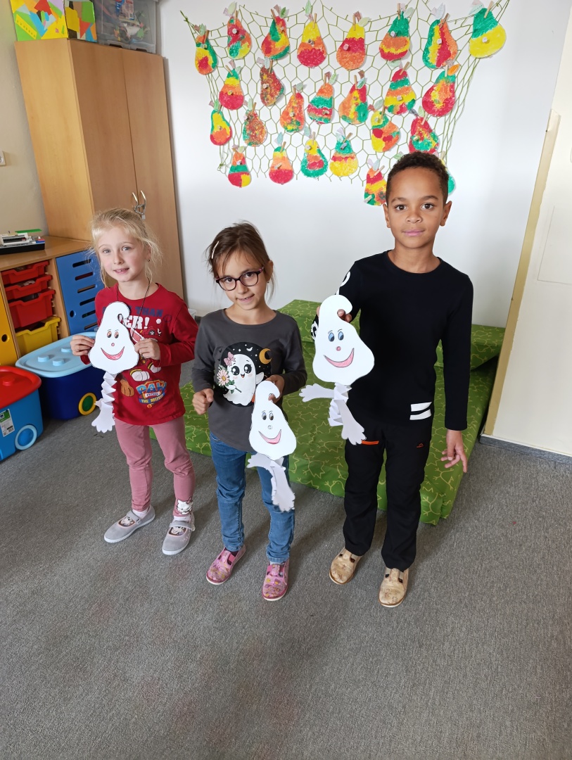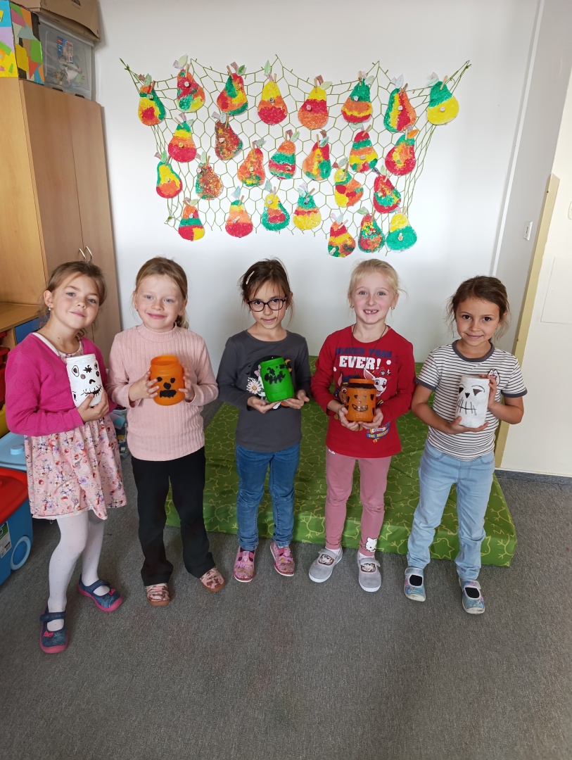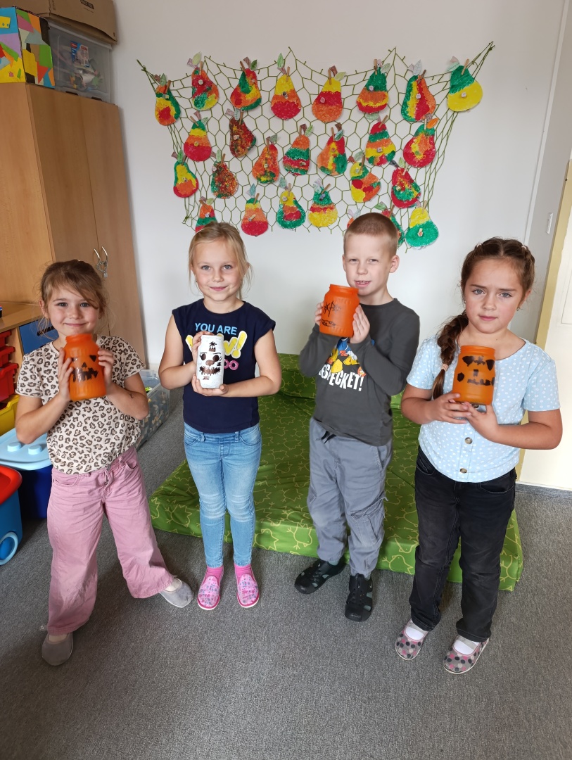 V závěru měsíce jsme se připravovali na Halloween – vyráběli jsme tematické dekorace, dlabali dýně a vyzdobili družiny podzimními i strašidelnými motivy.