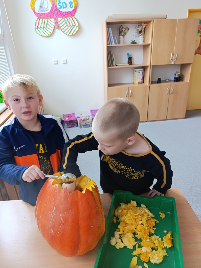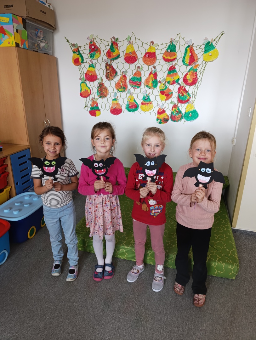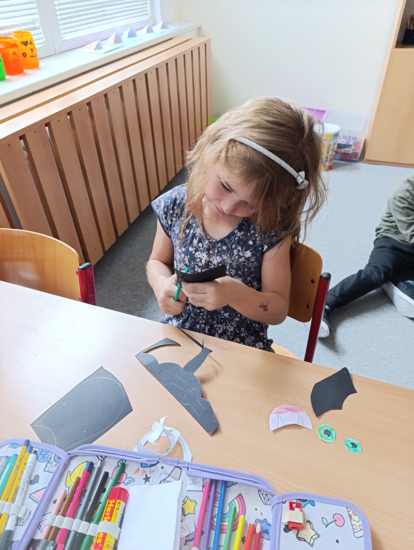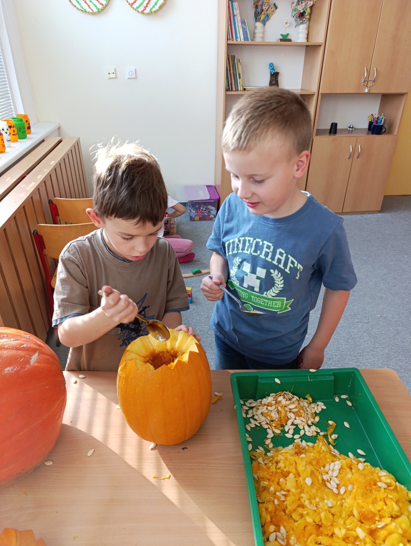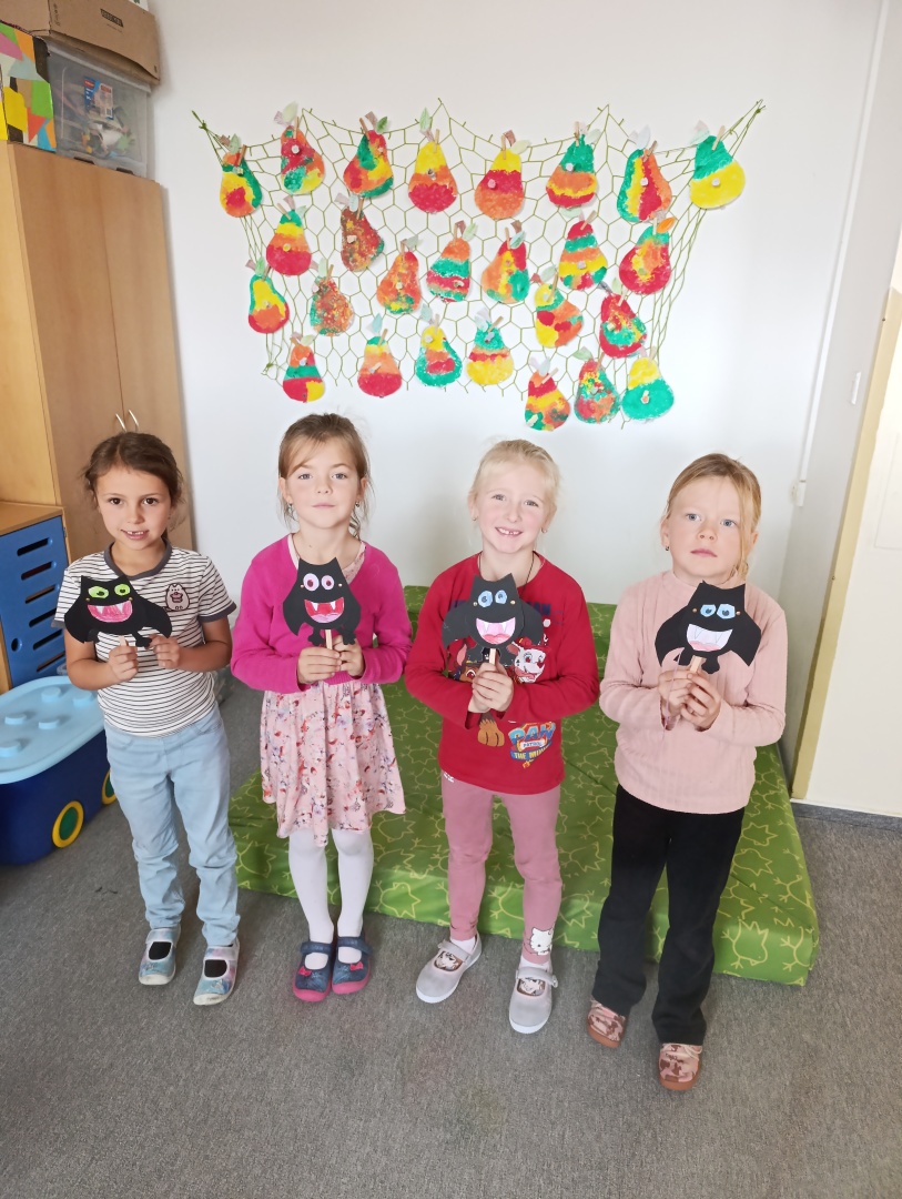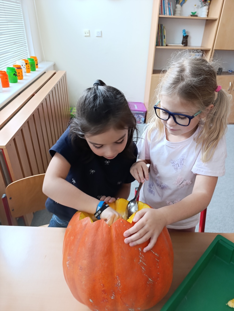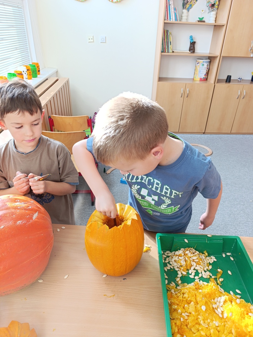 V závěru měsíce jsme se připravovali na Halloween – vyráběli jsme tematické dekorace, dlabali dýně a vyzdobili družiny podzimními i strašidelnými motivy.