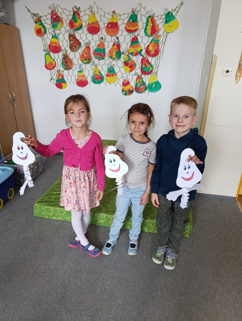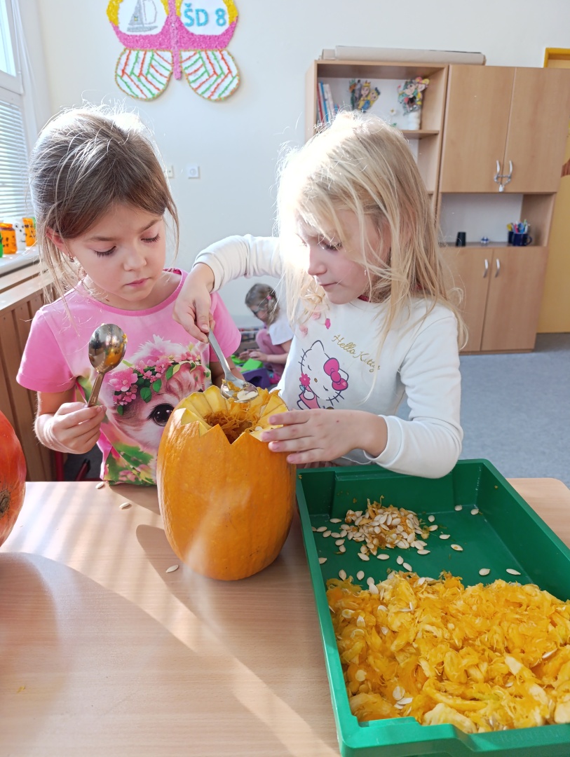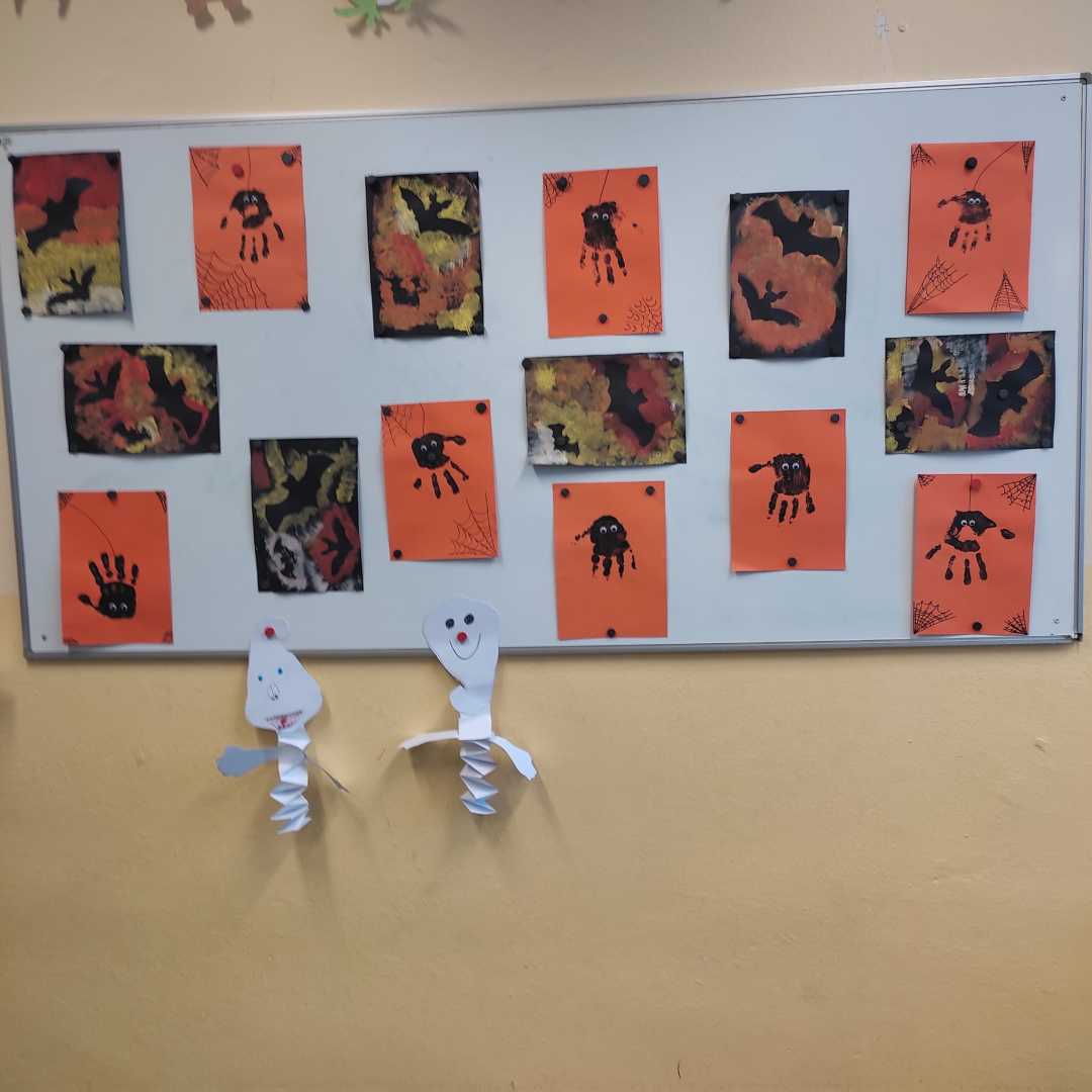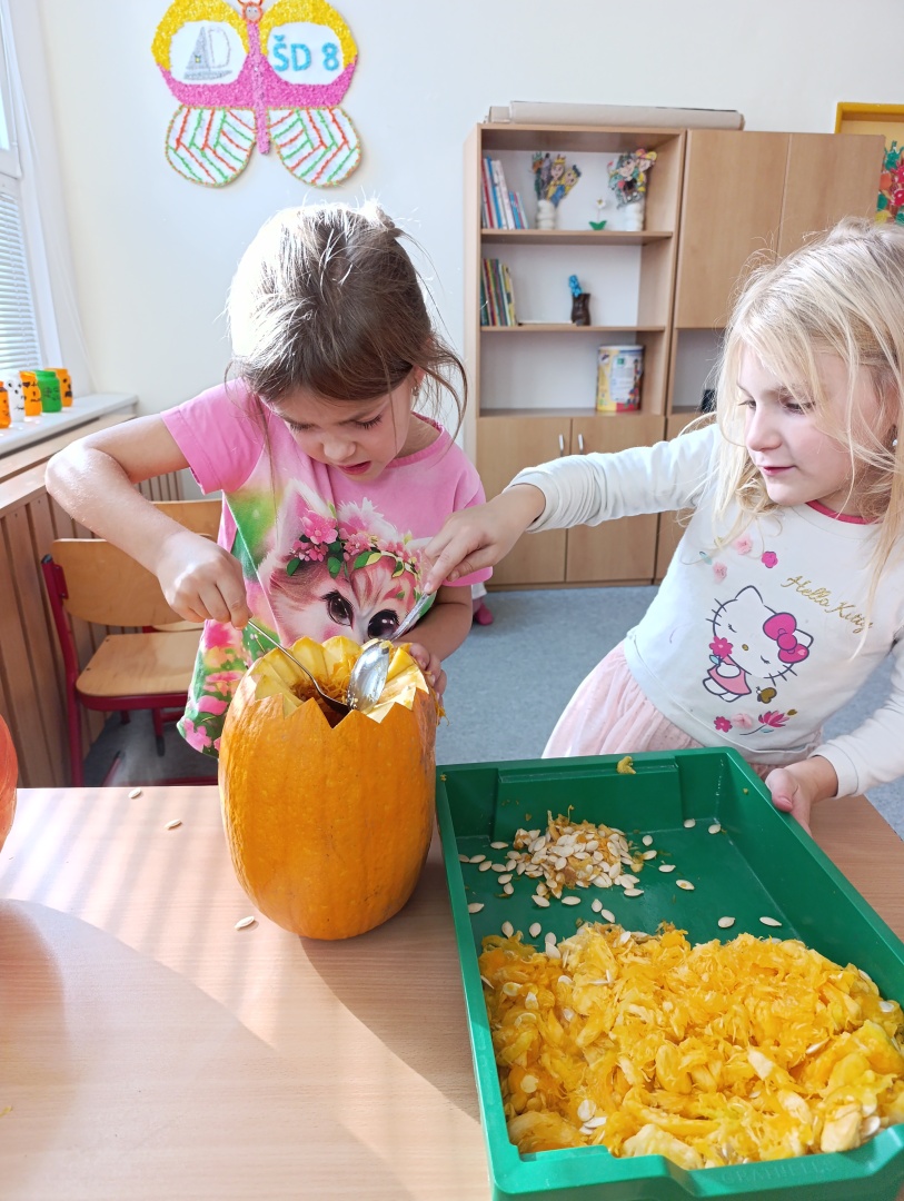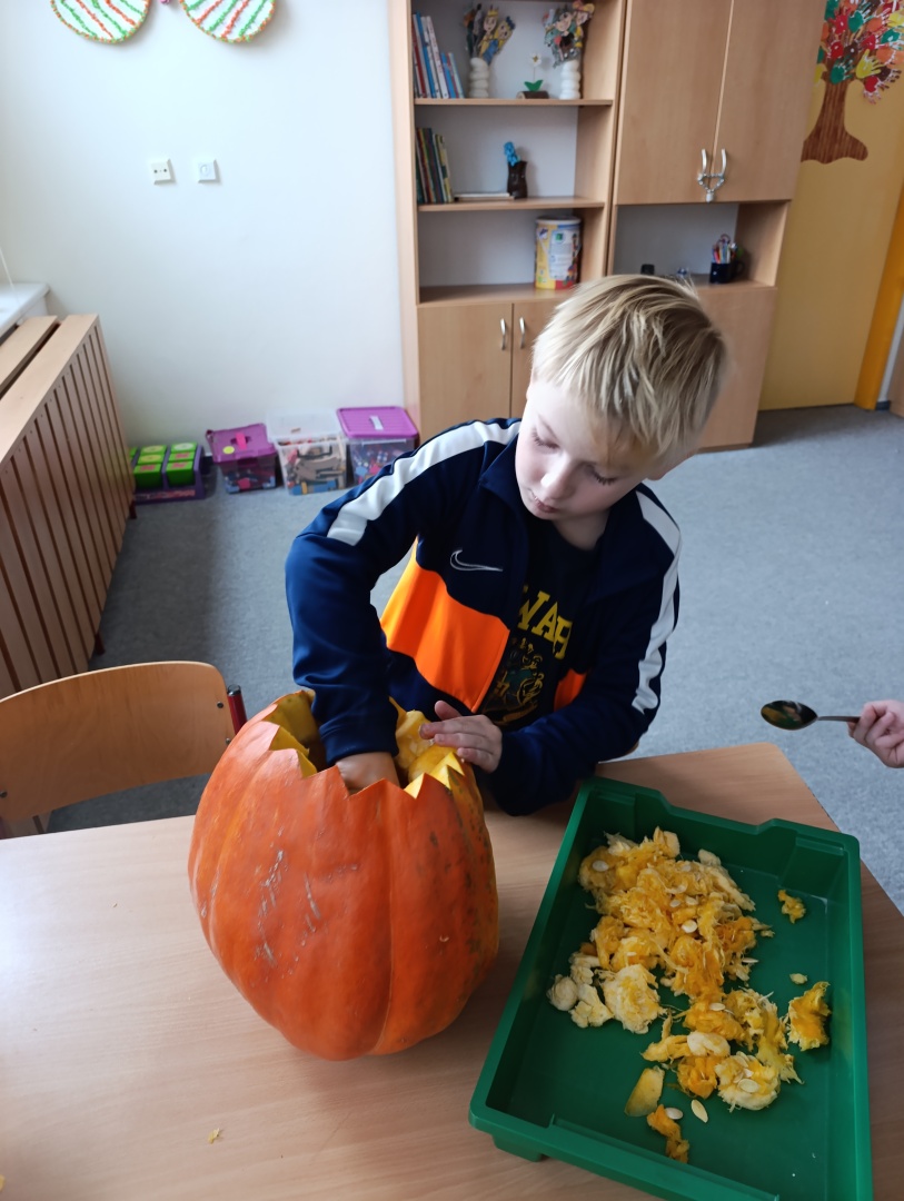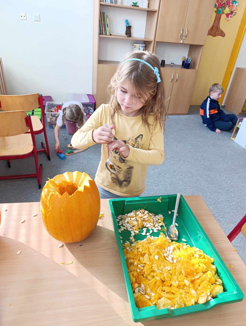 V závěru měsíce jsme se připravovali na Halloween – vyráběli jsme tematické dekorace, dlabali dýně a vyzdobili družiny podzimními i strašidelnými motivy.