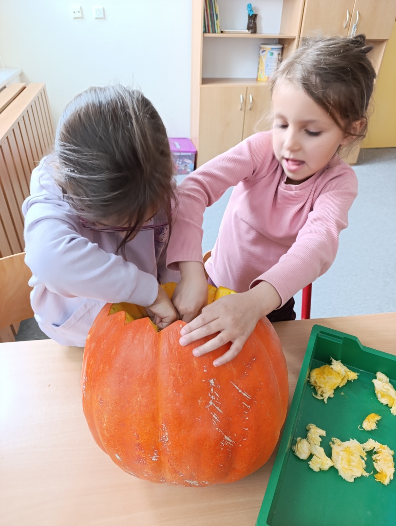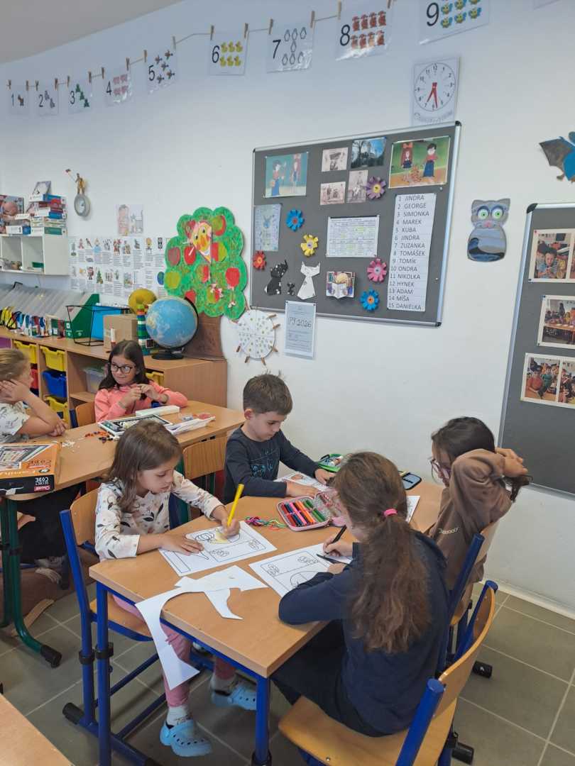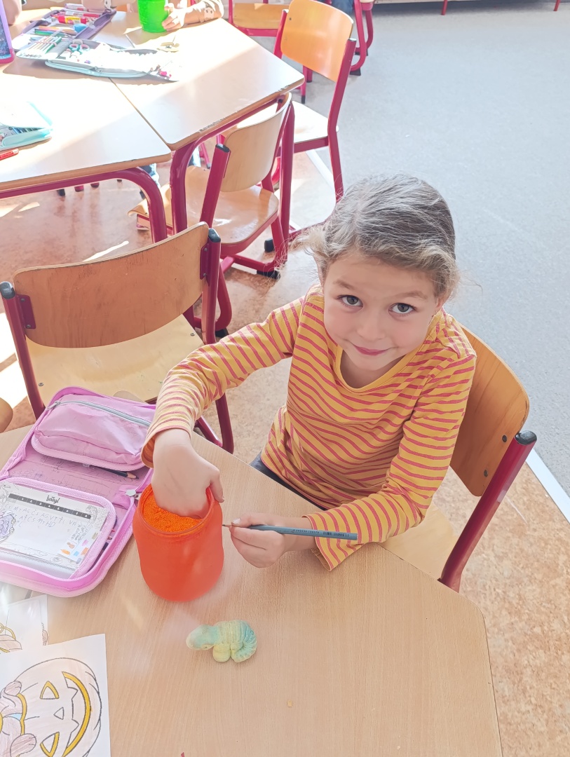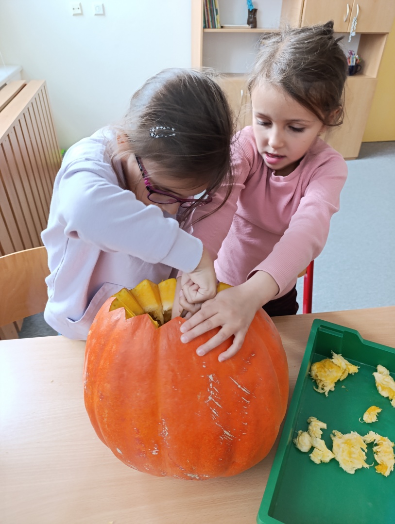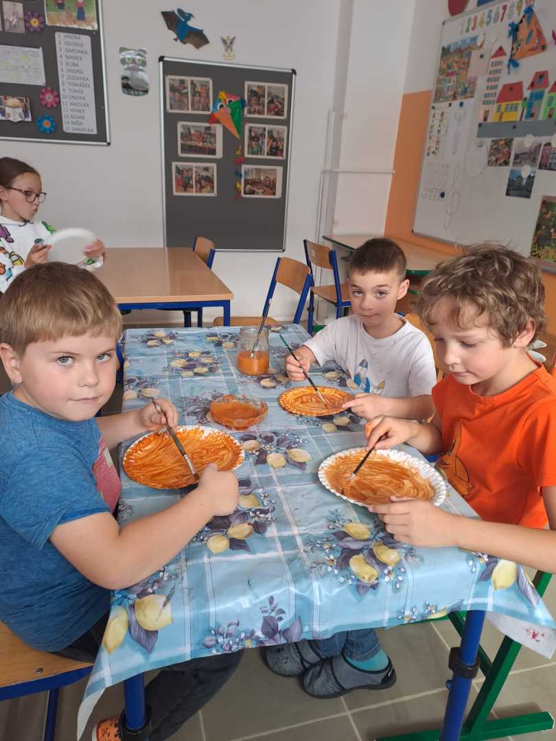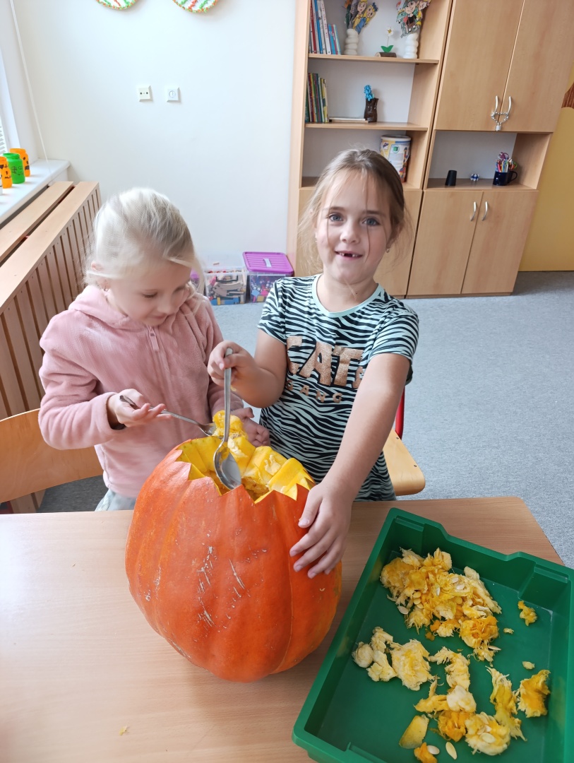V závěru měsíce jsme se připravovali na Halloween – vyráběli jsme tematické dekorace, dlabali dýně a vyzdobili družiny podzimními i strašidelnými motivy.