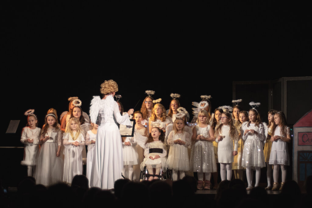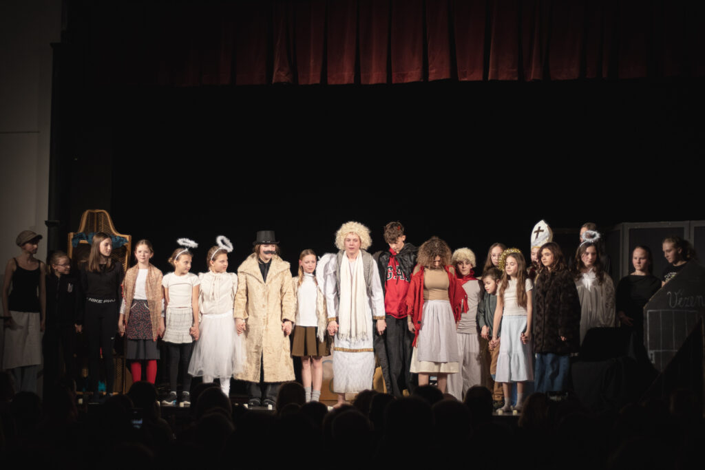 Ve středu 17. prosince proměnila ZŠ Dukelská sál Městského divadla Na Poště v „nebe“ plné andělů, kteří rozdávali štědrou předvánoční nadílku – úsměvy, radost a smích. Naši žáci si totiž připravili divadelní představení Anděl Páně a školní pěvecký kroužek Cora Bella zase vánoční koncert, kterými potěšili v adventním čase početné publikum divadla. Podvečerem diváky velmi příjemně provedla deváťačka Markéta Tomášková. Pohádka Anděl Páně v podání žáků dramatického kroužku vedeného pedagogy Markétou Novotnou a Ondřejem Šmakalem přinesl ty nejdůležitější momenty z druhé části filmové předlohy. V roli matly Petronia si publikum svým bezprostředním hereckým projevem získal deváťák Šimon Truhlář a stejně výborně ho doplnil lišácký pekelník v podání Václava Nováka z osmého ročníku. Ani představitelé dalších vedlejších rolí se nenechali zahanbit a ukázali, že umí se svým nadáním skvěle pracovat. Po zasloužených ovacích patřilo pódium pěveckému kroužku letos sestávajícímu z 31 malých i velkých zpěvaček. Dívky v kostýmech andělů odzpívaly ambiciózní setlist českých koled i populárních vánočních písní, včetně anglické. Na závěr se blýskly velmi vydařenou písní „Sněží, jsou Vánoce“ na ústřední melodii Bohemian Rhapsody od Queen a v nejednom oku se zaleskla slzička. Po skončení vystoupení se diváci přesunuli do předsálí, kde probíhala prodejní výstava obrazů žáků výtvarného semináře vedeného Eliškou Mazanec. Umělecká díla odhalila, že děti z naší školy v sobě nosí nejen herecký a pěvecký, ale i obdivuhodný výtvarný talent. Všem zapojeným žákům a učitelům děkujeme za vskutku krásný umělecký zážitek, díky kterému se na Vánoce těšíme ještě o něco víc.