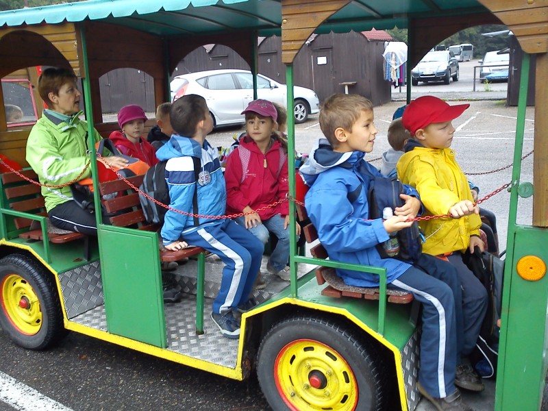 Z parkoviště pod zámkem Konopiště nás svezl vláček. Pan řidič si jízdu skutečně vychutnával a povozil nás znamenitě. Medvěd zprvu ve výběhu nebyl ,a tak jsme se ho na radu Elišky V. pokusili vylákat na vdolky, které jsme mu schovali od pondělního oběda. Situace nevypadala zpočátku nijak růžově. Když už jsme ale chtěli odejít, přece jen méďa vylezl:) Vdolky mu zachutnaly a chtěl další. Pak nepohrdl ani jablíčky a mrkvičkou od dětí. Mnozí z nás viděli medvěda Jiřího úplně poprvé ,čímž byla naše výprava o hodně veselejší.