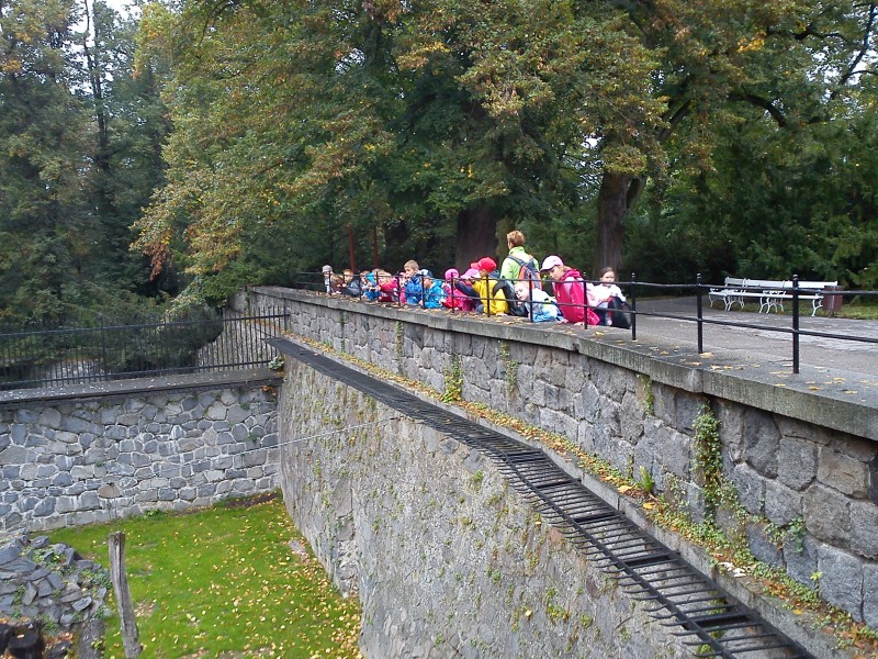 Z parkoviště pod zámkem Konopiště nás svezl vláček. Pan řidič si jízdu skutečně vychutnával a povozil nás znamenitě. Medvěd zprvu ve výběhu nebyl ,a tak jsme se ho na radu Elišky V. pokusili vylákat na vdolky, které jsme mu schovali od pondělního oběda. Situace nevypadala zpočátku nijak růžově. Když už jsme ale chtěli odejít, přece jen méďa vylezl:) Vdolky mu zachutnaly a chtěl další. Pak nepohrdl ani jablíčky a mrkvičkou od dětí. Mnozí z nás viděli medvěda Jiřího úplně poprvé ,čímž byla naše výprava o hodně veselejší.