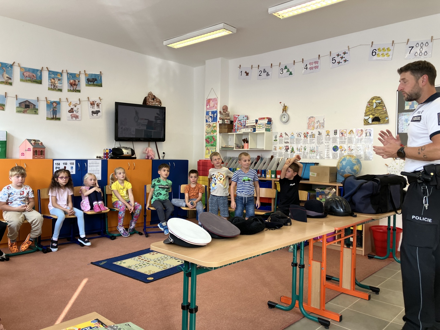 V pondělí 8. 9 2025 nás v rámci preventivního programu navštívil policista pan Bican. Děti se dozvěděly něco nového o práci policistů a jejich vybavení. Také byly poučeny, jak si chránit zdraví své a kamarádů.
