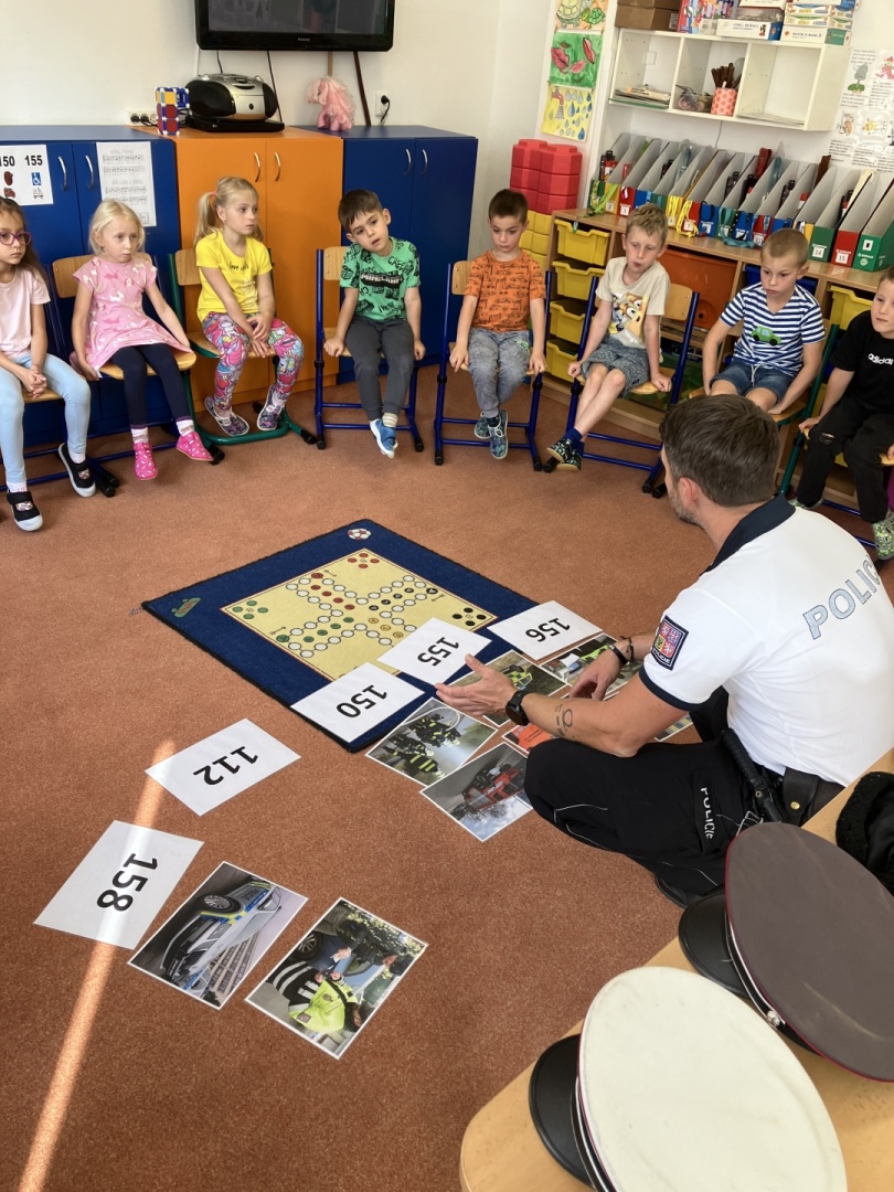 V pondělí 8. 9 2025 nás v rámci preventivního programu navštívil policista pan Bican. Děti se dozvěděly něco nového o práci policistů a jejich vybavení. Také byly poučeny, jak si chránit zdraví své a kamarádů.