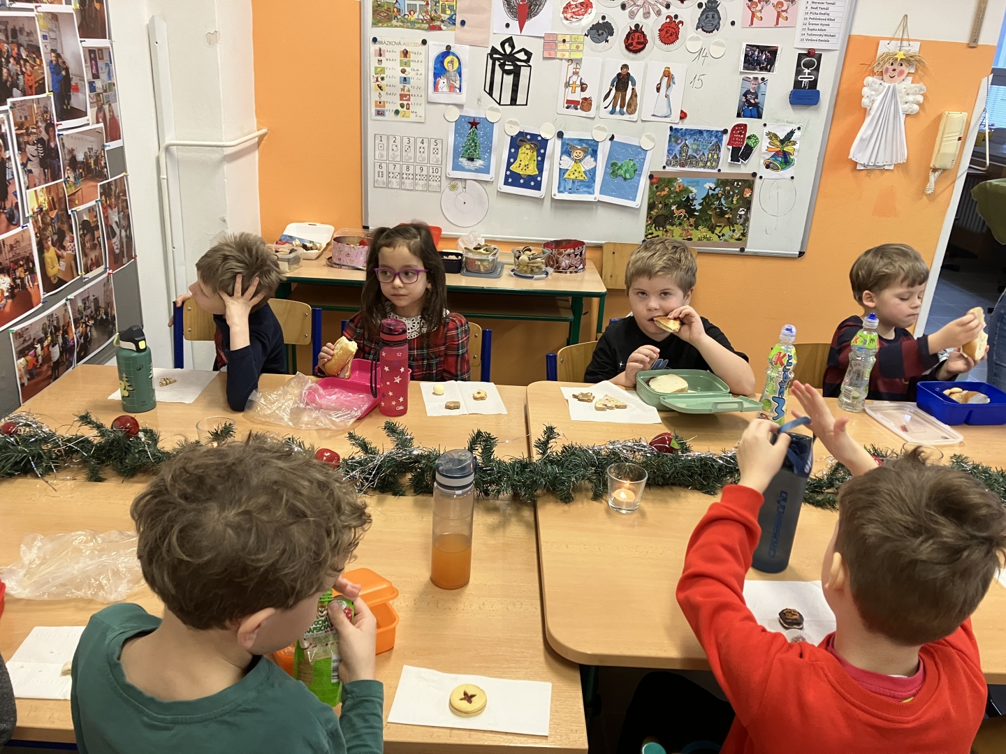 Už od konce listopadu se všechny děti těšily na kouzelný měsíc, kdy chodí Ježíšek. Protože jsme v tomto měsíci měli hodně aktivit, utekl nám adventní čas rychle. Vyzdobili jsme si třídu a v pátek 5.12. nás navštívil Mikuláš, čert a andělé. Ve čtvrtek 11.12. jsme pro rodiče připravili vánoční besídku, 12.12. jsme se zúčastnili vánočního vystoupení Kateřiny Ševidové v tělocvičně školy, ve středu 17.12. jsme navštívili vánoční výstavu v DDM, také jsme byli na procházce vánočně vyzdobeným Benešovem. Velkým překvapením pro nás bylo vítězství v soutěži O nejlépe vyzdobenou vánoční třídu. Poslední den před prázdninami byl v přípravce vánoční, s předáváním dárků a ochutnávkou cukroví od maminek.